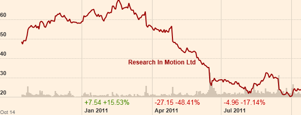 All this comes at a precarious time for RIM’s management. The company is losing market share to Apple’s iOS and the Google’s Android system (down from 19% to 12% a year earlier).  In the quarter ending in August its revenues were 10% lower than a year before at $4.2 billion and profits were down by more than half.  This chart plots the RIMM share price for the last 12 months (source FT.com Market Data).  RIMM share price closed the week at $23.97 from a peak of $70.54 in Feb 2011.
