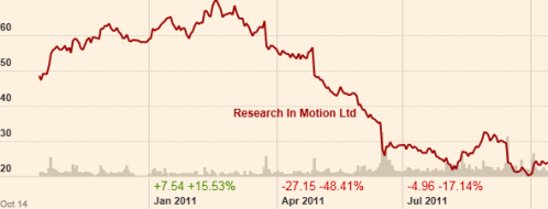 Moreover, the merchant bank Jaguar Financial, an investor in the Canadian firm, is campaigning to have RIM broken up or sold off.  According to Reuters, Jaguar, wants co-chief executives Jim Balsillie and Mike Lazaridis out.  By having co-CEOs it is difficult to clarify ownership in order to identify the “single throat to choke”.  Jaguar said on Tuesday that it has the support of eight percent of RIM’s shareholders for its plans – enough to demand a shareholders’ meeting about the matter.  This choice may be taken away from the Senior Executives if the market intrinsically believes that there is more shareholder value if RIM is broken up.